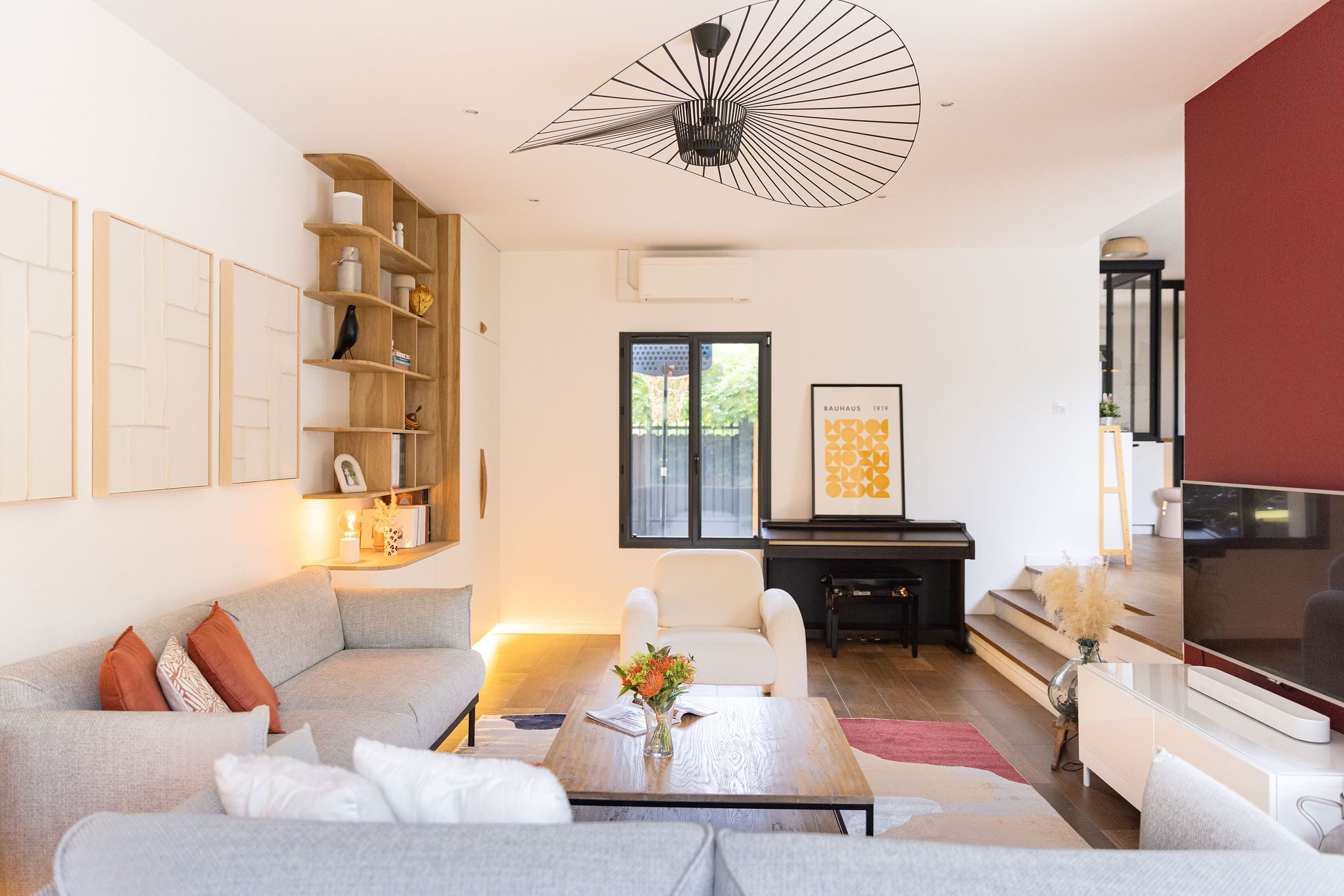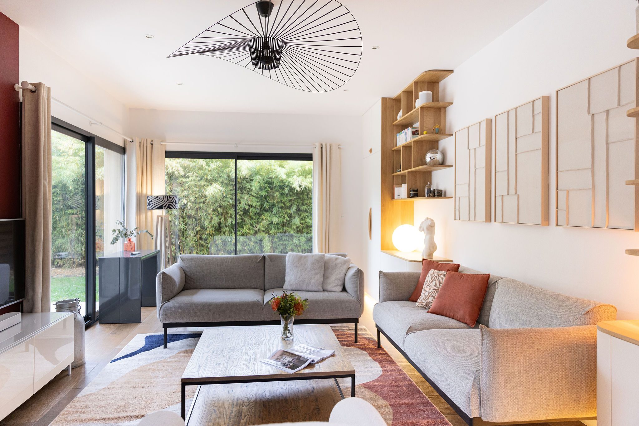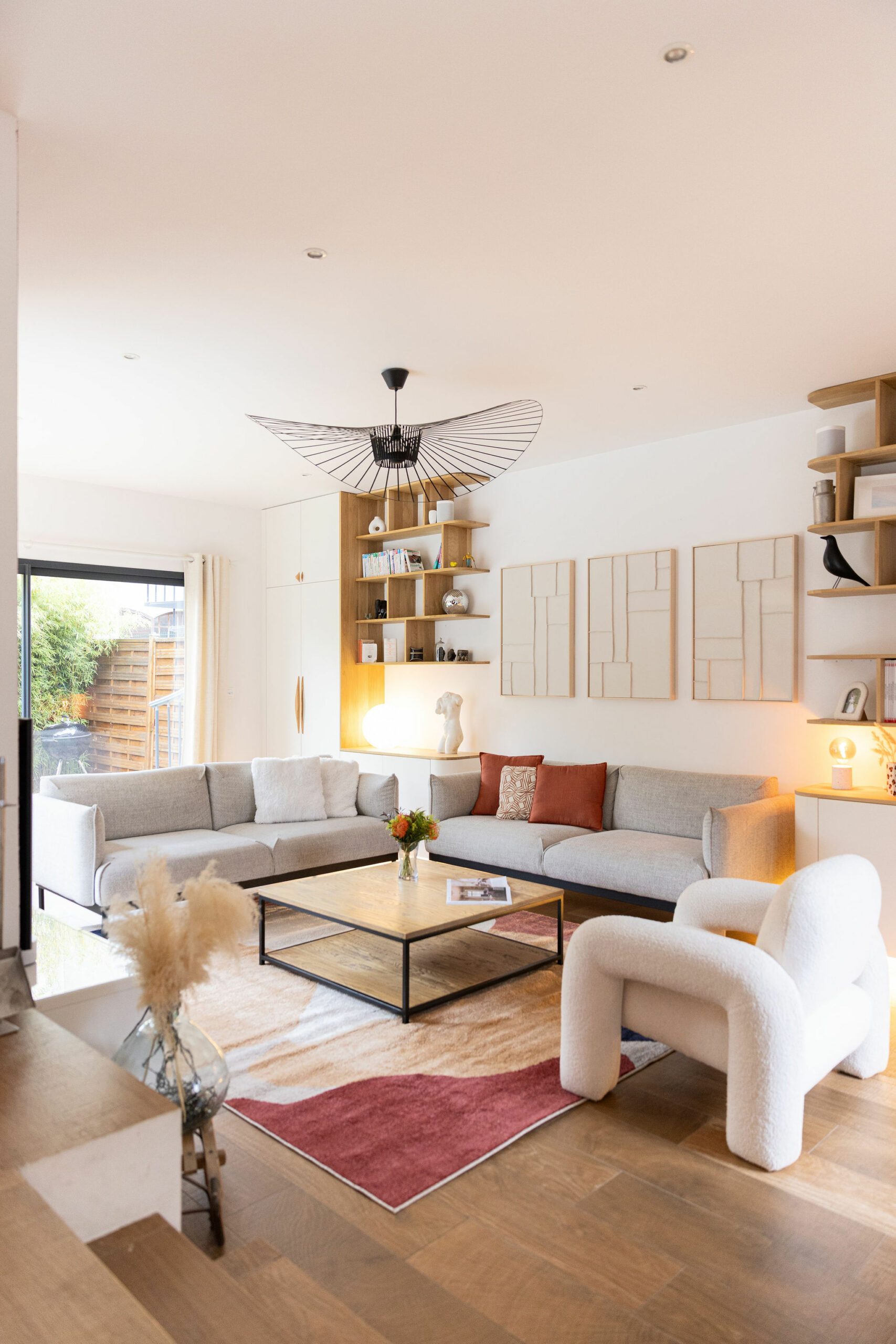 Le salon est totalement ouvert vers le jardin. Une bibliothèque a été imaginée en utilisant des caissons du commerce surmonté d’étagères. Le cuir des lanières tenant les étagères apportent de la chaleur à l’ensemble. Pour habiller le mur, mes clients n’étaient pas surs de leurs envies et voulaient pouvoir changer en fonction de leurs envies. Je leur ai donc proposé d’encadrer du papier peint, ce qui leur permet de pouvoir changé facilement leur décoration en fonction de la saison par exemple !