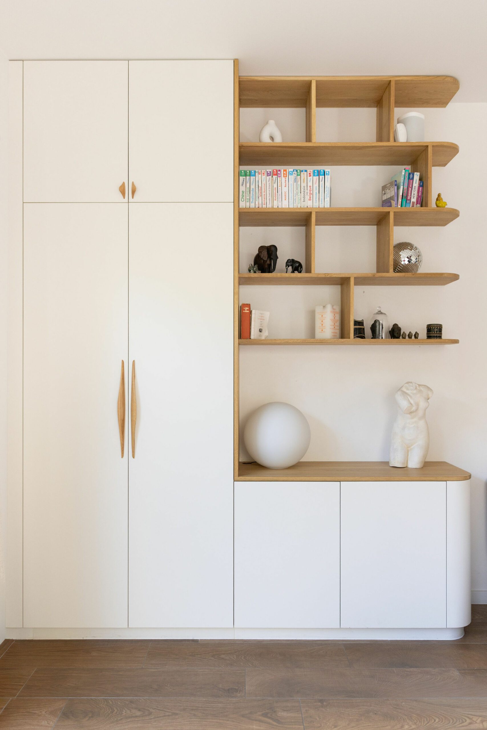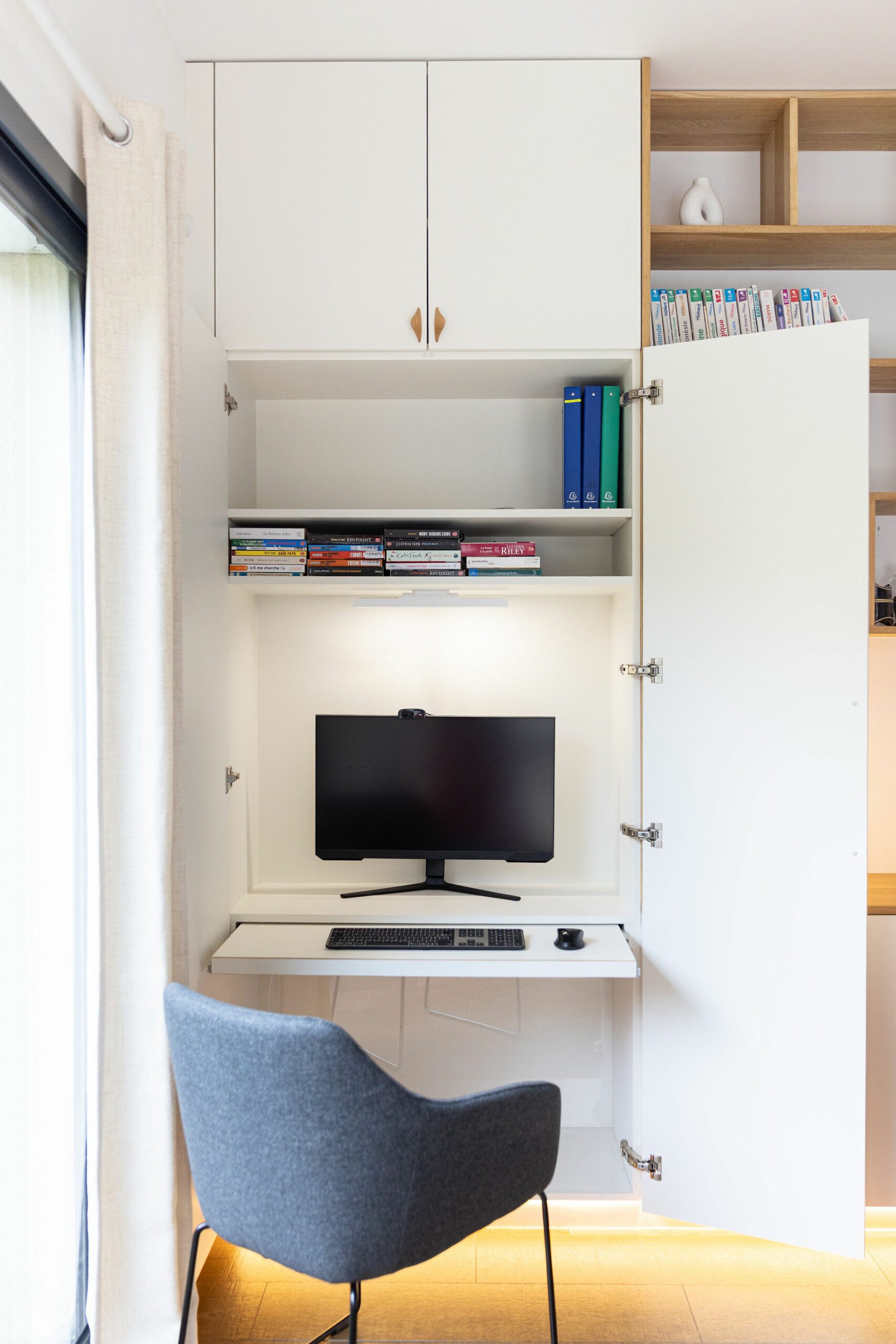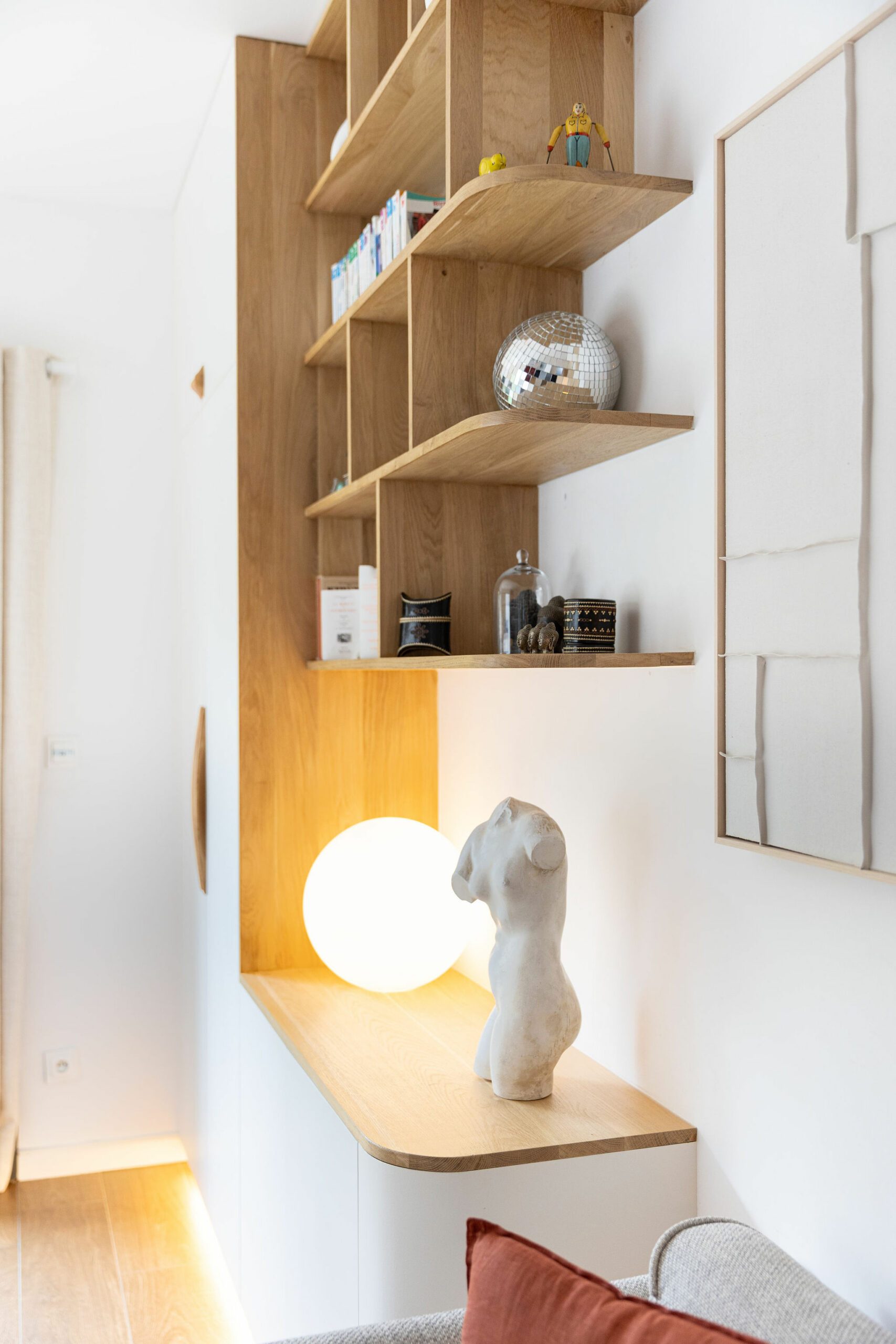 Le salon est totalement ouvert vers le jardin. Une bibliothèque a été imaginée en utilisant des caissons du commerce surmonté d’étagères. Le cuir des lanières tenant les étagères apportent de la chaleur à l’ensemble. Pour habiller le mur, mes clients n’étaient pas surs de leurs envies et voulaient pouvoir changer en fonction de leurs envies. Je leur ai donc proposé d’encadrer du papier peint, ce qui leur permet de pouvoir changé facilement leur décoration en fonction de la saison par exemple !